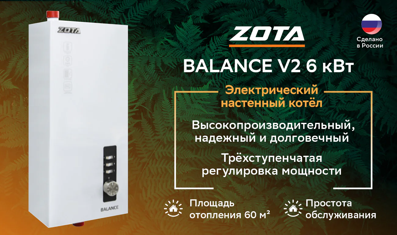 Серия Zota Balance V2 — улучшенная серия электрических котлов ZOTA Balance. Они так же, как и предшественники отличаются экономичностью, простотой и малогабаритностью. Среди преимуществ серии: широкий модельный ряд теплоизолированный корпус, порошковая покраска всех элементов, трёхступенчатая регулировка мощности/температуры нагрева воды от +30 до +90℃;
