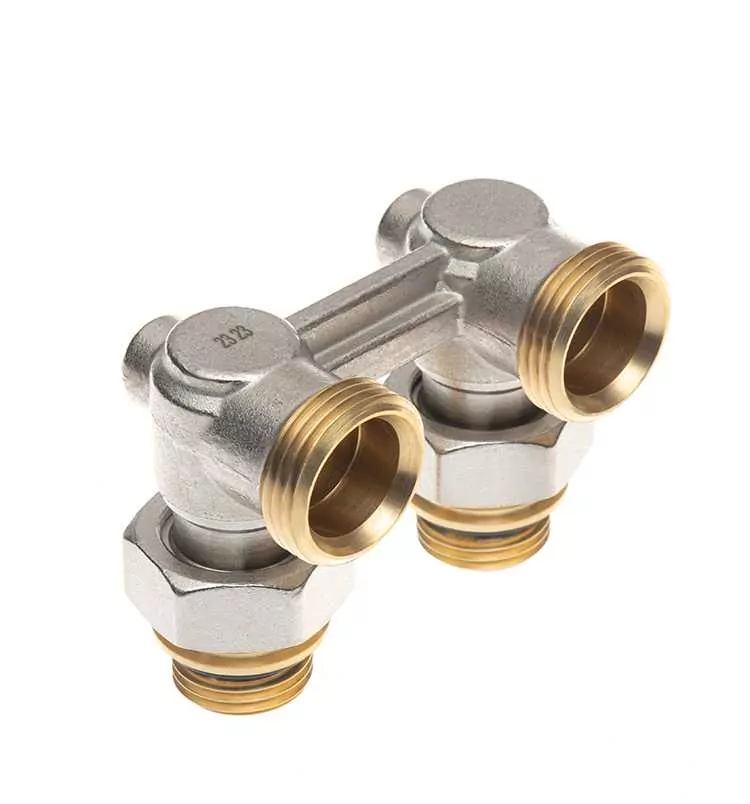 - Клапан РИДАН LV-KB угловой, с переходниками, PN10, межосевое расстояние 50 мм, резьба наружная G 3/4 — наружная R 1/2, KVs 1.4 м³/ч