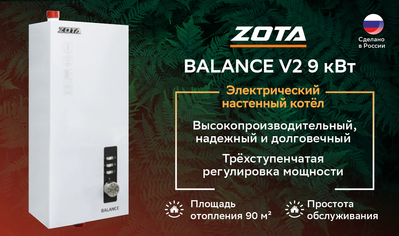 Серия Zota Balance V2 — улучшенная серия электрических котлов ZOTA Balance. Они так же, как и предшественники отличаются экономичностью, простотой и малогабаритностью. Среди преимуществ серии: широкий модельный ряд теплоизолированный корпус, порошковая покраска всех элементов, трёхступенчатая регулировка мощности/температуры нагрева воды от +30 до +90℃;