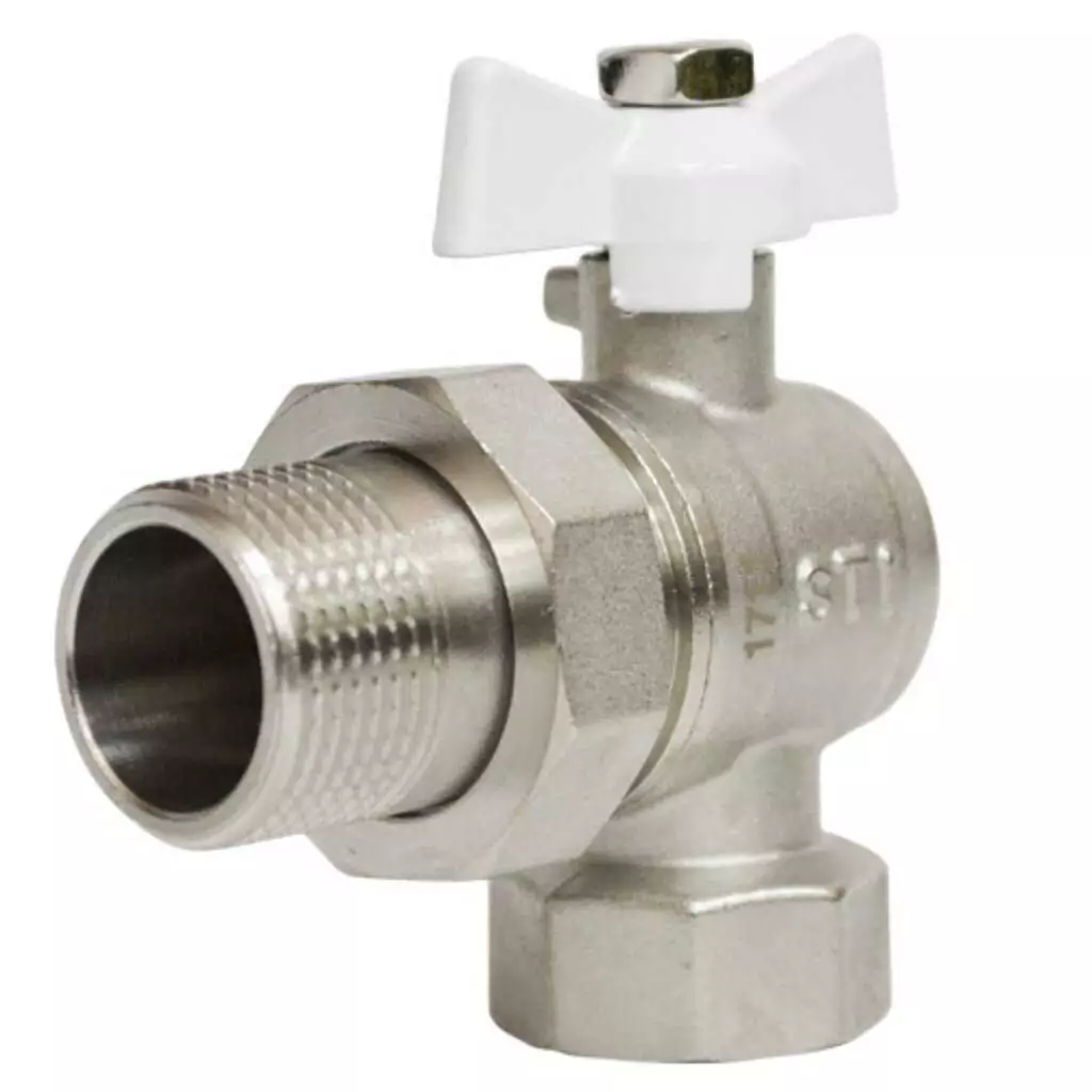 Кран шаровой угловой латунный бренда STI с накидной гайкой. Применяется в качестве запорной арматуры на трубопроводах систем питьевого и хозяйственно-питьевого назначения, горячего водоснабжения, отопления, сжатого воздуха, жидких углеводородов, а также на технологических трубопроводах, транспортирующих жидкости, не агрессивные к материалам крана.