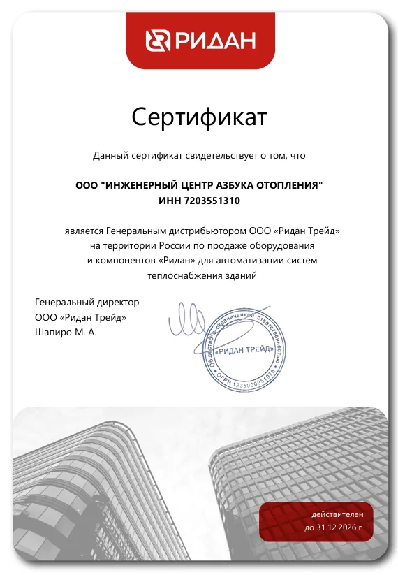 Сертификат генерального дистрибьютора компании «Ридан»