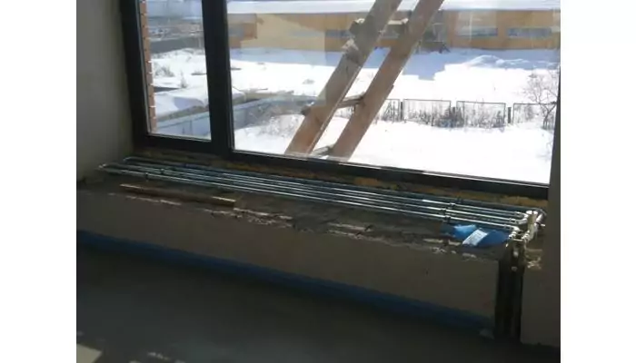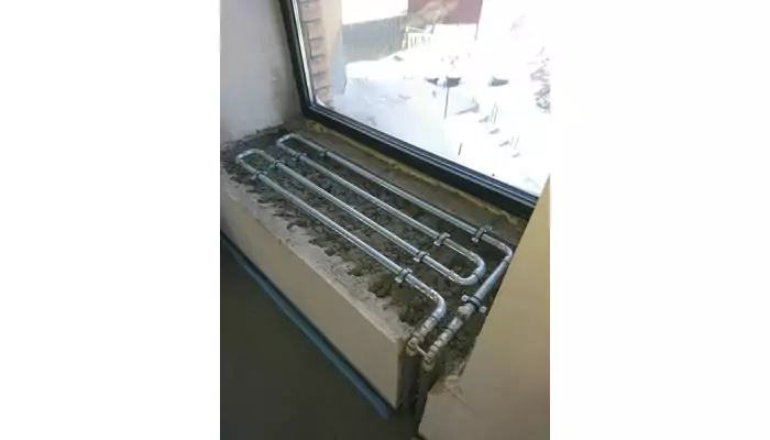В подоконниках встроены ручной работы регистры, изготовленные из пресс нержавеющей трубы Sanha